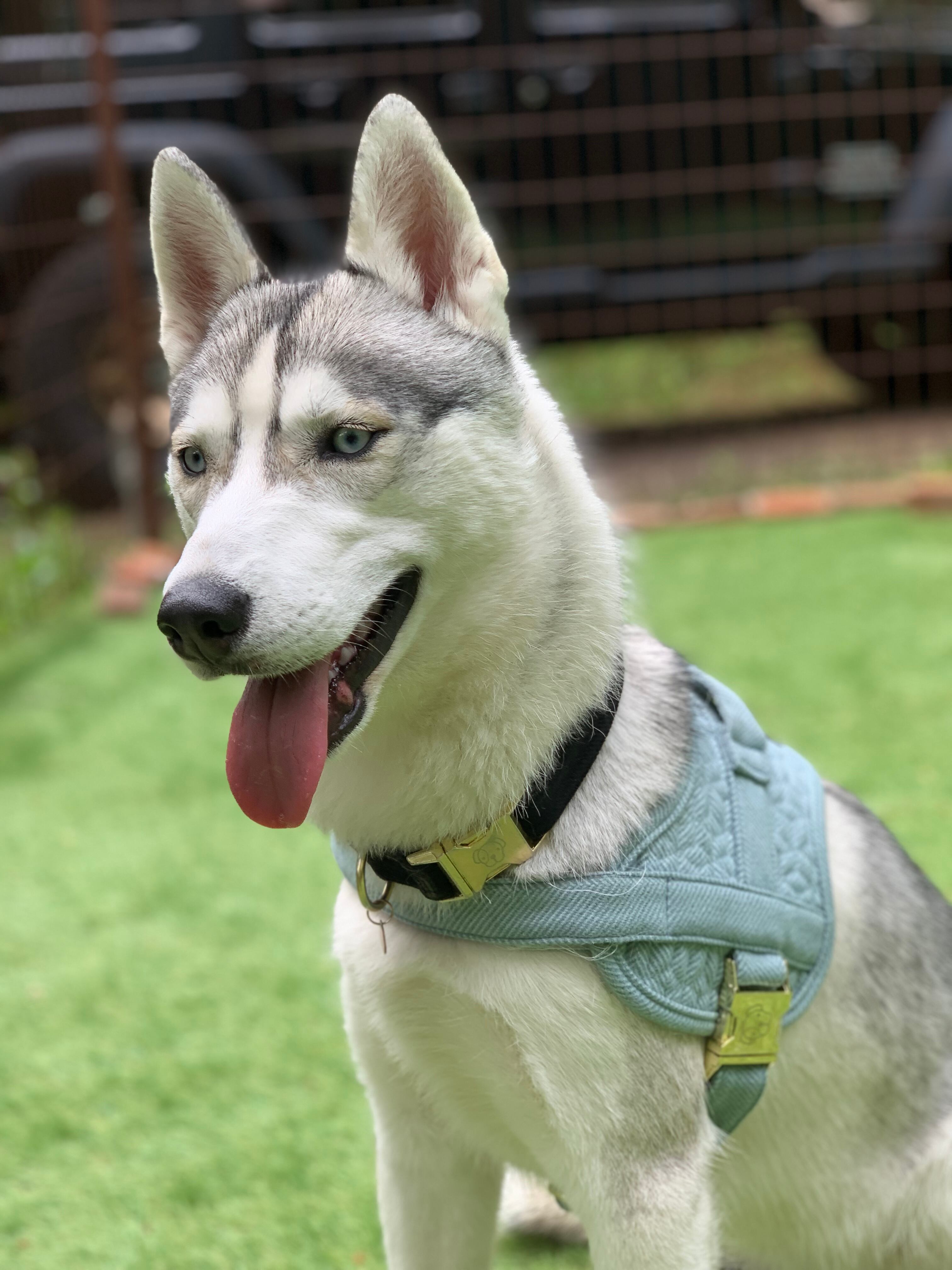 今回は、カラーはピンク、サイズはMのみの限定販売となります。(ハスキーがつけているのは同じシリーズのブルーです)。
